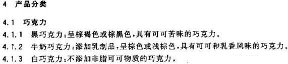 根據(jù)GB/T 19343-2003 巧克力及巧克力制品(2017-9-1作廢)將巧克力分為三類:黑巧克力、牛奶巧克力、白巧克力。